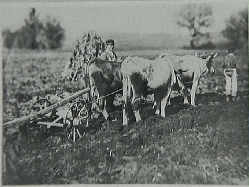 Plöjning med tre stutar. Längst till vänster: eventuellt Karl Nilson, Severins systerson.