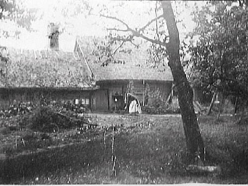 En kvinna går i trädgården vid en ryggåsstuga med tillbyggt loft.