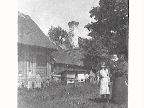 Högloftsstuga; ryggåsstuga med två loft. En kvinna står med två barn framför huset och vid fasaderna står bikupor; de till vänster är av halm.