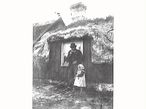 En piprökande man och en liten flicka står framför ett ovanligt stort fönster till en ryggåsstuga. Det är "Bolsestugan" i Trönninge som Severin Nilson 1908 köpte till målarateljé. Notera den ovanliga taktäckningen av ålgräs som vitnar när det torkat och kräver tjocka lager för att hålla tätt. Stugan är en högloftsstuga med tillbyggda loft vid båda gavlarna.