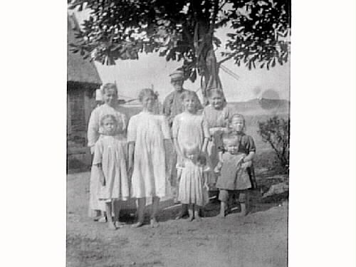 Ett äldre par med sju barn i olika åldrar under ett träd vid knuten av en byggnad i Ugglarp.