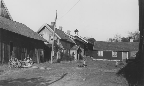 Gården Siken i Onsala. Bostadshus och ekonomibyggnader kring en stenlagd gårdsplan, där en kvinna och ett litet barn befinner sig. Vällingklockan sitter fortfarande kvar på gavelnocken bortanför mangårdsbyggnaden. Sådana användes före urens tid på större gårdar för att signalera arbetsdagens början och slut eller samla gårdsfolket.