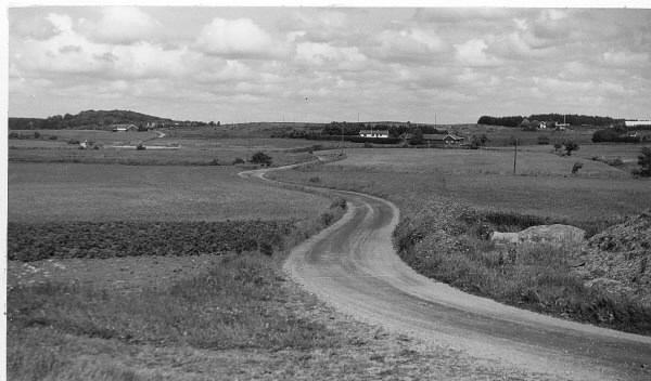 Grusväg som slingrar sig genom odlingslandskapet i norra Onsala. Bilden är tagen mot öster från gården Mossen.