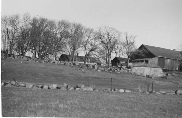 "Rösagården", Onsala. Fotografiet visar en lantgård uppe på ett krön med stengärdsgårdar i grässlänten. Till höger ligger ekonomibyggnaderna och förmodligen är det bostadshuset till vänster om dem. Utseendet på det stämmer dock inte med det långsträckta boningshuset från 1921 på Rösans gård. Kan det vara Rösan 5, kallat Prästäng? Dit flyttades nämligen det äldsta boningshuset från Rösansgården 1865, bebott av skeppare Jöns Christensson. Rösan 7 avstyckades och fick nytt boningshus 1945, vilket var tre år efter att bilden togs. Meddela oss gärna om du kan bekräfta vilken gård bilden visar.
