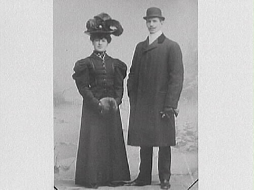 Ateljéfoto av ett par i vinterkläder mot snöig landskapsfond. Hon bär en liten pälsmuff.