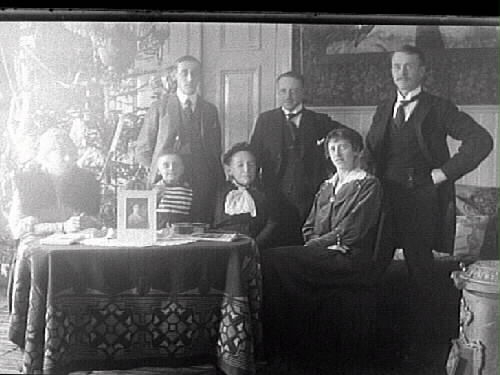 Familjebild vid ett bord klätt i jugendduk och i bakgrunden en julgran. På bordet står ett fotografi.