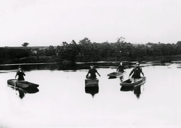 Laxdragare i Ätran i sina laxekor. Dragningen skedde parvis. Mellan båtarna hade man ett kort garn (nät) som hölls i ena handen medan man stakade sig fram med den andra. Om en lax gick in i garnet styrde man ihop båtarna och drog upp laxen.
