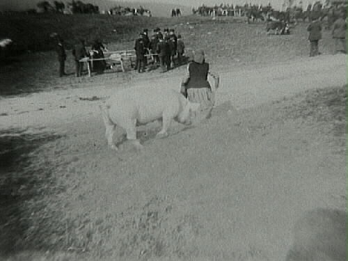 Severins syster Charlotta Nilson på väg till marknaden i Sjönevad för att sälja en gris.