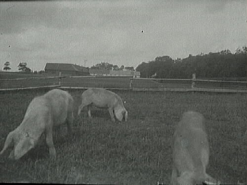 Betande grisar på åker med staket och lantgård i bakgrunden.