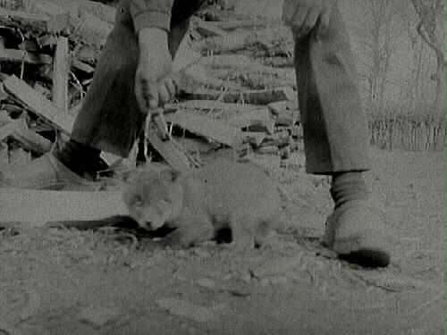 Hundvalp eller annan djurunge vid en mans ben intill en vedtrave.