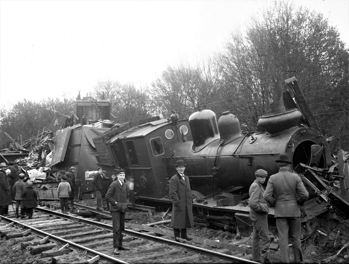 Tågolycka. Ånglok som spårat ut. På rälsen står människor, mest pojkar och män, och betraktar förödelsen.