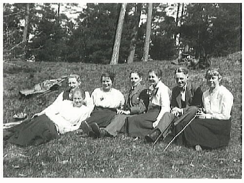 Gruppbild. Sju ungdomar sitter i en solig skogsbacke. En av ynglingarna har käpp och tjejen intill honom håller i en pinne.