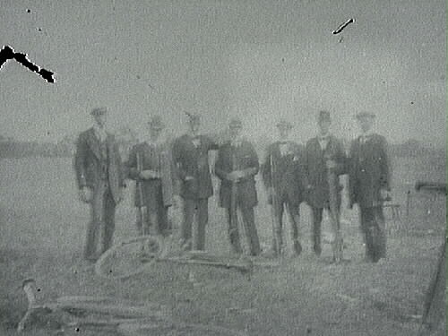 Sju män, varav fyra med gevär, står på en åker. I förgrunden ligger två cyklar. Eventuellt en skytteförening.