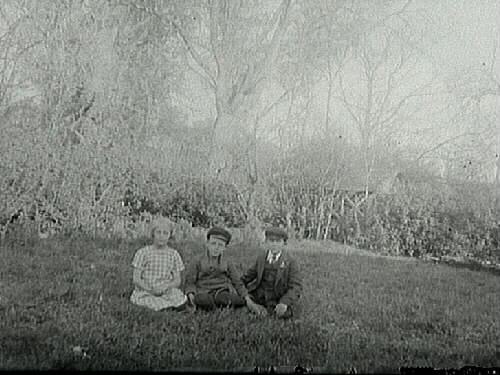 Tre barn, en flicka och två pojkar, sitter på gräset i en trädgård.