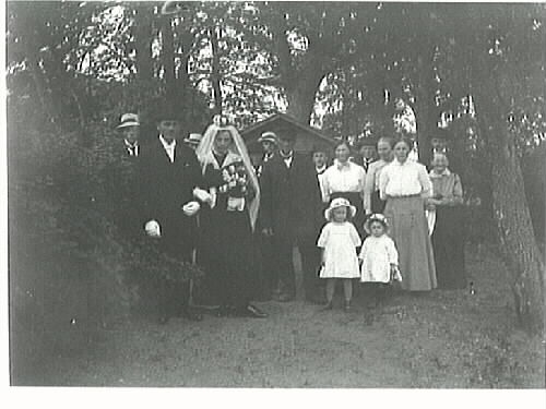 Brupar och bröllopsgäster i en träddunge med en bod i bakgrunden. Bruden klädd i svart klänning, vit slöja och brudkrona. Brudgummen klädd i frack och hög hatt. Två barn i blomprydda hattar står framför de vuxna gästerna.