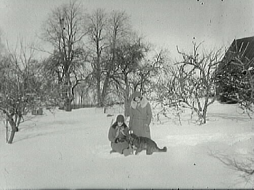 Snöbild. Två kvinnor med en hund i en snöig trädgård med fruktträd och i bakgrunden bikupor (se även E5380).