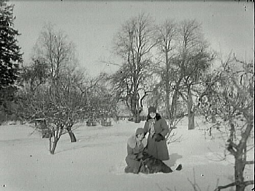 Snöbild. Två kvinnor med en hund i en snöig trädgård med fruktträd och i bakgrunden bikupor (se även E5379).