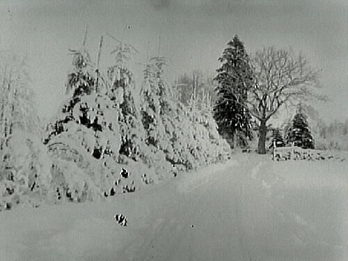 Snöbild på landsväg kantad av granar på ena sidan och höga träd i fonden.