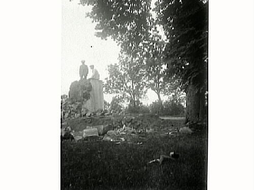 Två män på en ruin med nedrasad sten i förgrunden och ett stort träd intill.