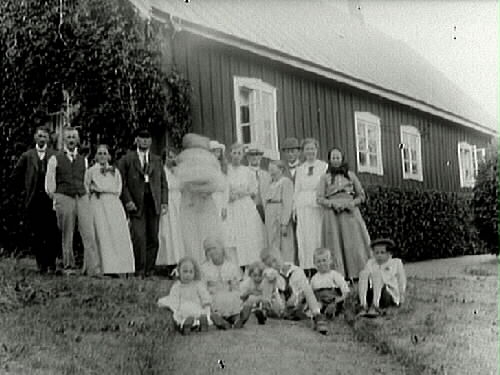 Gruppbild av ca nitton personer av olika kön och åldrar i trädgården framför en mangårdsbyggnad.