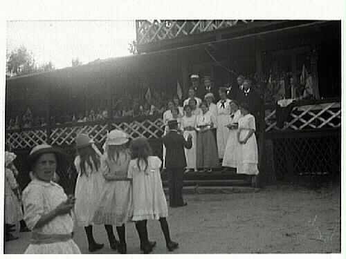 Sångkör med ungdomar står på en trappa till en lång veranda, full av folk. I förgrunden står finklädda flickor och lyssnar.