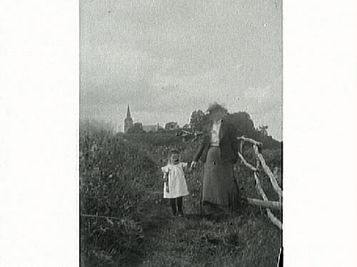 Kvinna med flicka i handen på en stig mot kyrkan i bakgrunden. Ett knotigt staket kantar stigen.