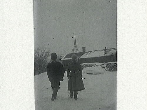 Två barn går i snön med ryggarna åt fotografen mot ett timrat hus. Framför det ligger vedtravar och en eka, bakom huset sticker en kyrkspira upp. (Samma motiv som bild E5436)
