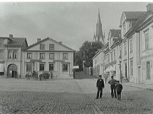 Stadvy med kullerstenstorg och putsarkitektur. I bakgrunden står ett hästekipage och i förgrunden tre pojkar. I bakgrunden en kyrkspira.