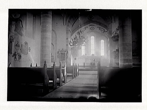 Vamlingbo kyrka. Långskeppet sett mot koret. Väggmålningar.