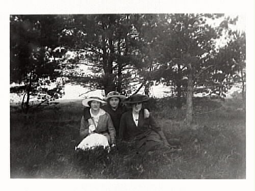Tre kvinnor i naturen, sitter i en backe med träd.