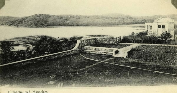 Brevkort, "Tjolöholm med Mausoléet." Vy över nedre delen av den formella trädgården och James Dicksons mausoleum på Tjolöholms slott. Han dog 1898 och änkan Blanche Dickson lät uppföra byggnaden åt honom 1902. I bakgrunden ses holmen med Storeskog och däremellan havsviken.