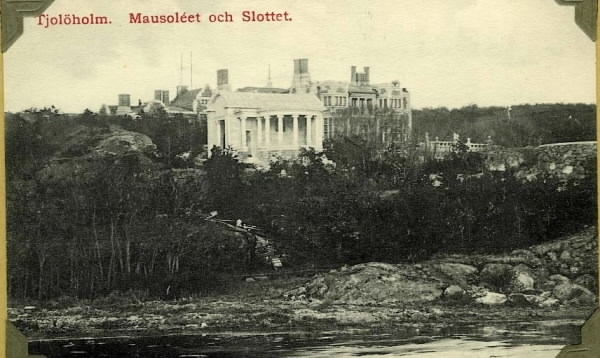 Vykort, "Tjolöholm. Mausoléet och Slottet." James Dicksons mausoleum sett med stranden i förgrunden och slottet i bakgrunden. Han dog 1898 och änkan Blanche Dickson lät uppföra byggnaden åt honom, vilken stod klar 1902.