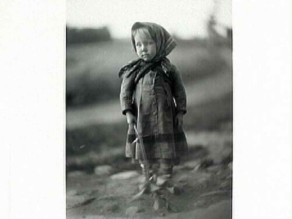 Barnporträtt av en liten flicka med spö i handen. Förlaga till målningen Vall-Greta.