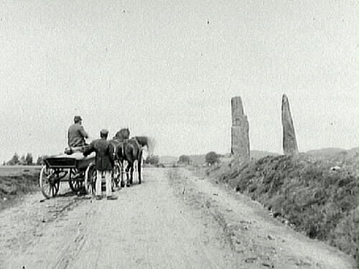 Hagbards galge och Signes galge vid Asige hed. På vägen står ett hästekipage med två män som betraktar stenarna. 1880-tal.