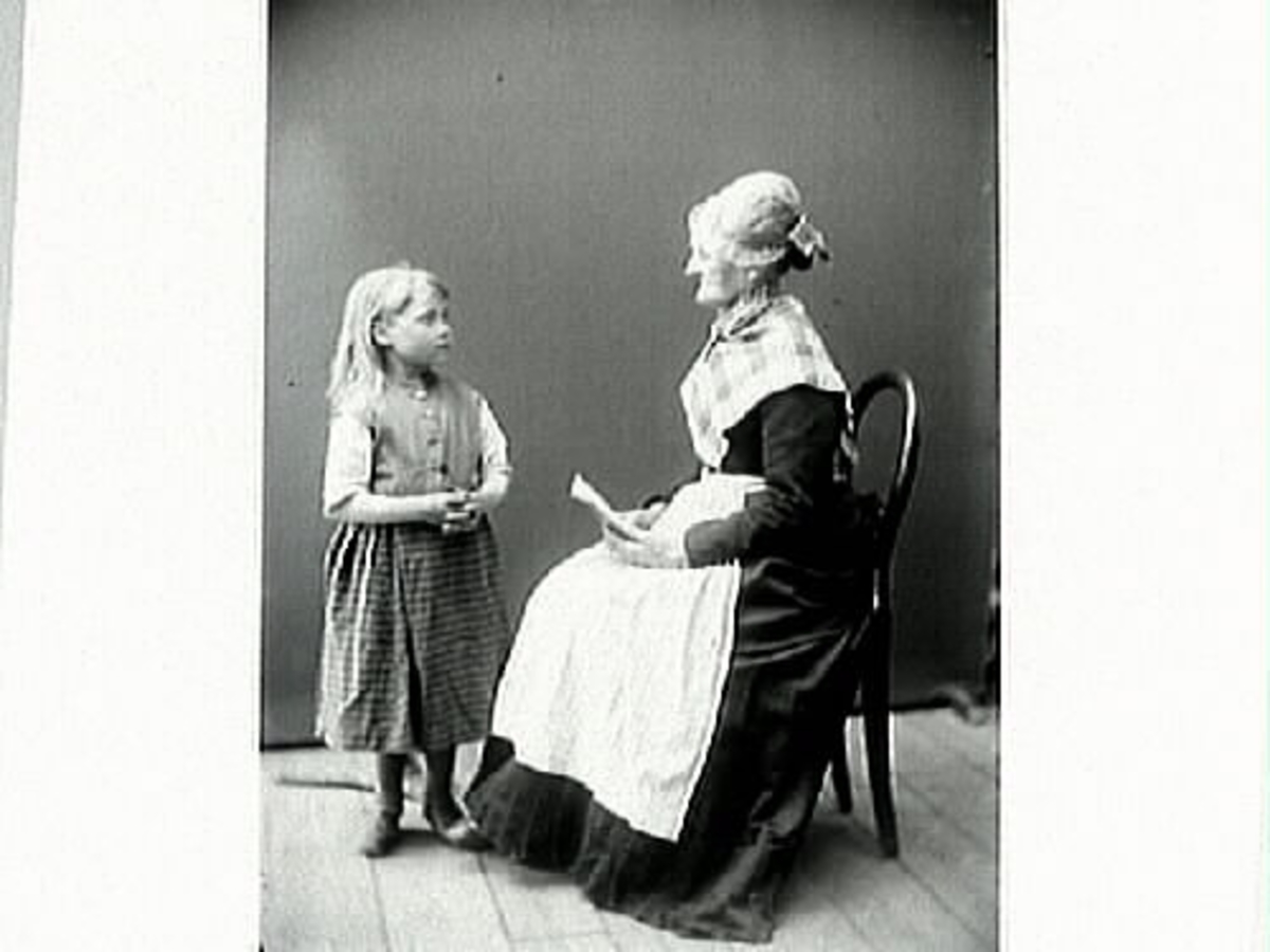 En äldre kvinna sitter på en stol med en flicka med knäppta händer framför sig.