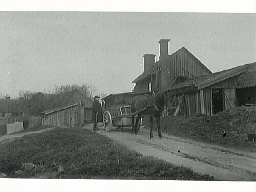 Häst med skrinda och två gubbar vid gårdsbebyggelse.
