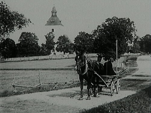 Ekipage med häst och vagn på landsväg. I bakgrunden syns en kyrka.