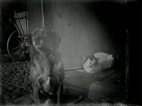 Hund och katt. Bakom husknuten skymtar en vagn på kullerstensgatan.