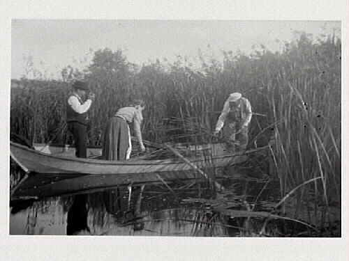 Vass. Två män och en kvinna skördar vass i en eka, "sävskärning".
