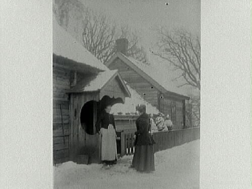 Två damer vid skunken till en högloftsstuga. Snöbild.