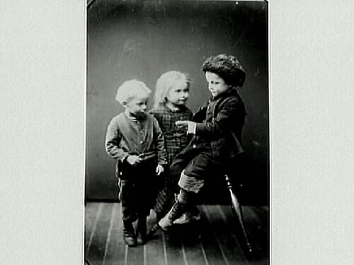 "Lasse sittande på trebent stol". Bredvid står en pojke och en flicka.