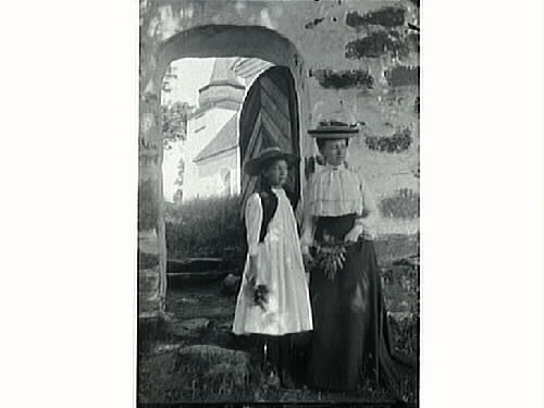 En kvinna står med en flicka i handen i en stigport. Båda bär hatt och håller en bukett i handen. Kyrkan (okänd) skymtar bortom porten.