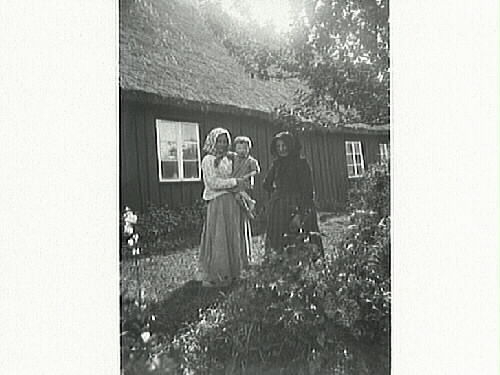 En kvinna står med ett barn på armen tillsammans med en äldre kvinna framför ett bostadshus med halmtak. Frodig grönska omger dem.