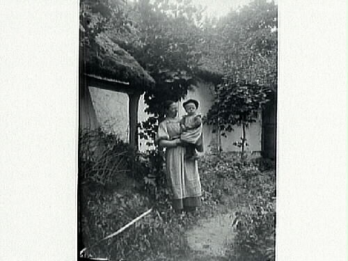 En kvinna med ett barn på armen står vid ett ålderdomligt hus med halmtak. Barnet bär basker. Längs husväggen står två späda lönnar i vildvuxen grönska. 1890-tal.
