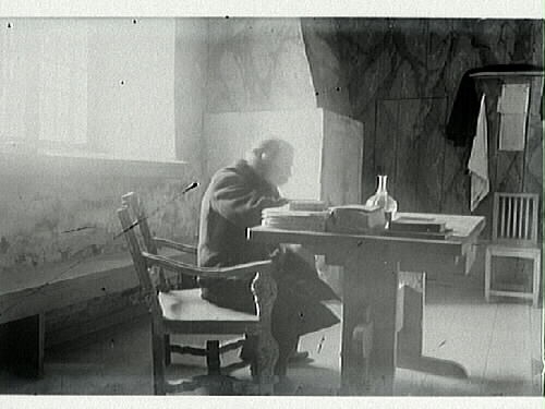 En äldre man sitter i en länsstol vid ett bockbord med böcker och en glaskaraff. Bakom honom ett stort fönster med långbänk under. Brädväggen och dörren ser ut att vara marmoreringsmålade. Kan vara en sakristia.