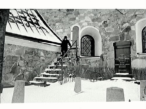 Snöbild. En man i rock och hög svart hatt går nedför en trappa från en stor gammal stenkyrka. Till höger i bild syns en gravsten över grosshandlare H L Broman med maka J C Ljungdahl.