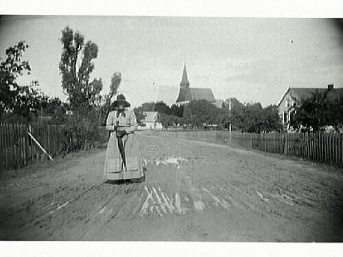 Dam med paraply och hatt står på en bred, lerig väg försedd med spjälstaket av trä på båda sidorna. I bakgrunden syns ett brant kyrktak med spira.