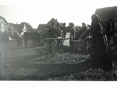 Marknad med kreatur. Kvinnor i hucklen vid bord i förgrunden och män i bakgrunden