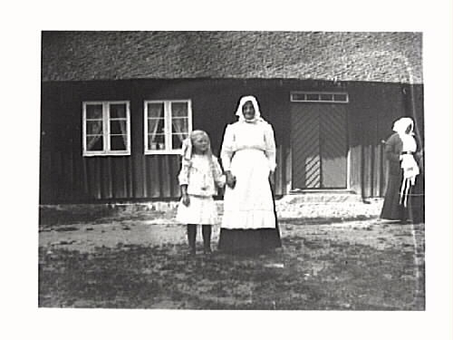 Äldre kvinna håller en flicka i handen. De står mellan ett par fönster och ingången till ett bostadshus med halmtak. Till höger står ytterligare en gammal kvinna.