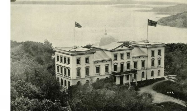 Brevkort vars motiv visar föregångaren i nyrenässans till dagens Tjolöholms slott. Byggherre var ryttmästare Werner Santesson och stod klar 1867 med 35 rum och enorm takkupol som vette åt havet. Men konstruktionen var undermålig då salthaltigt byggmaterial använts, så huset förföll kraftigt och revs i samband med att det nya slottet stod klart 1904. Nyrenässansbyggnaden hade också ersatt en äldre manbyggnad.